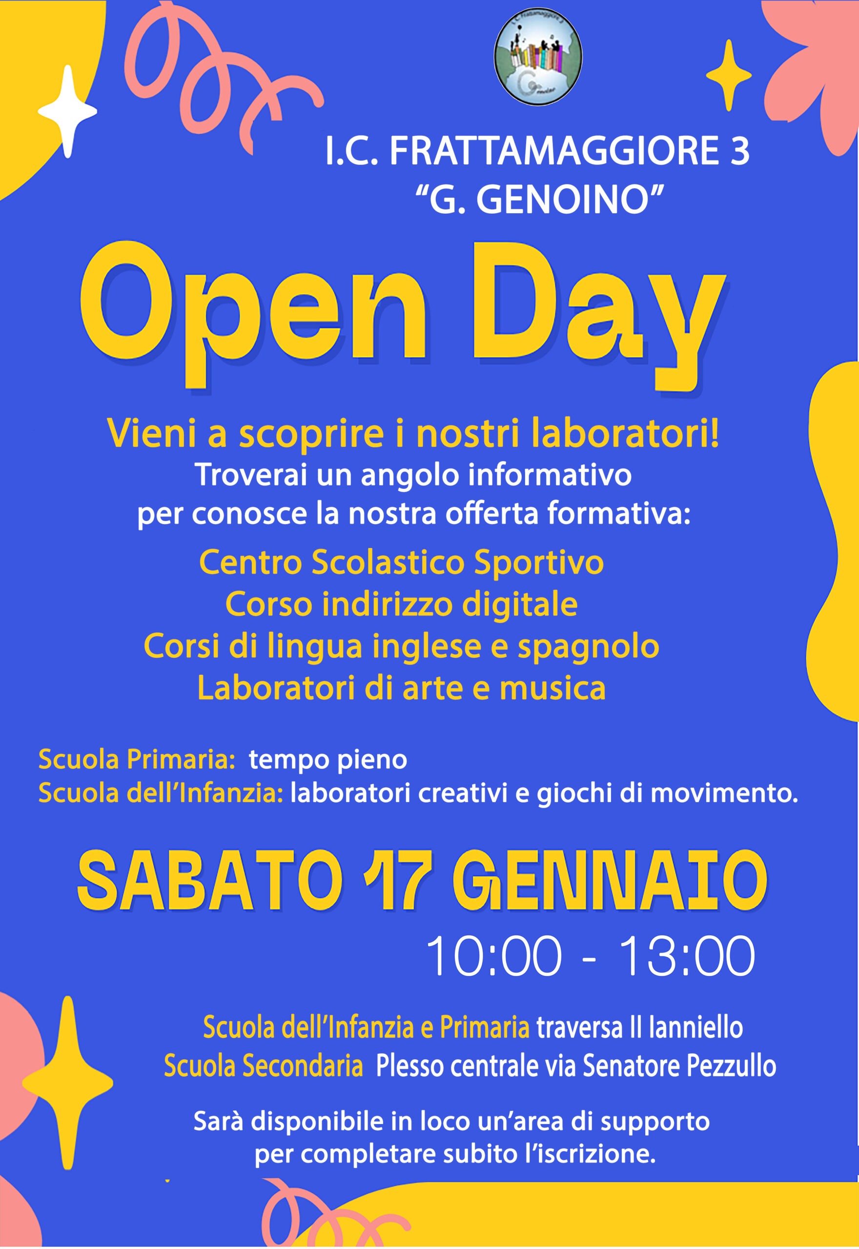 L’I.C. "G. Genoino" di Frattamaggiore apre le porte alle famiglie e ai futuri alunni per una giornata dedicata alla scoperta della nostra comunità scolastica.